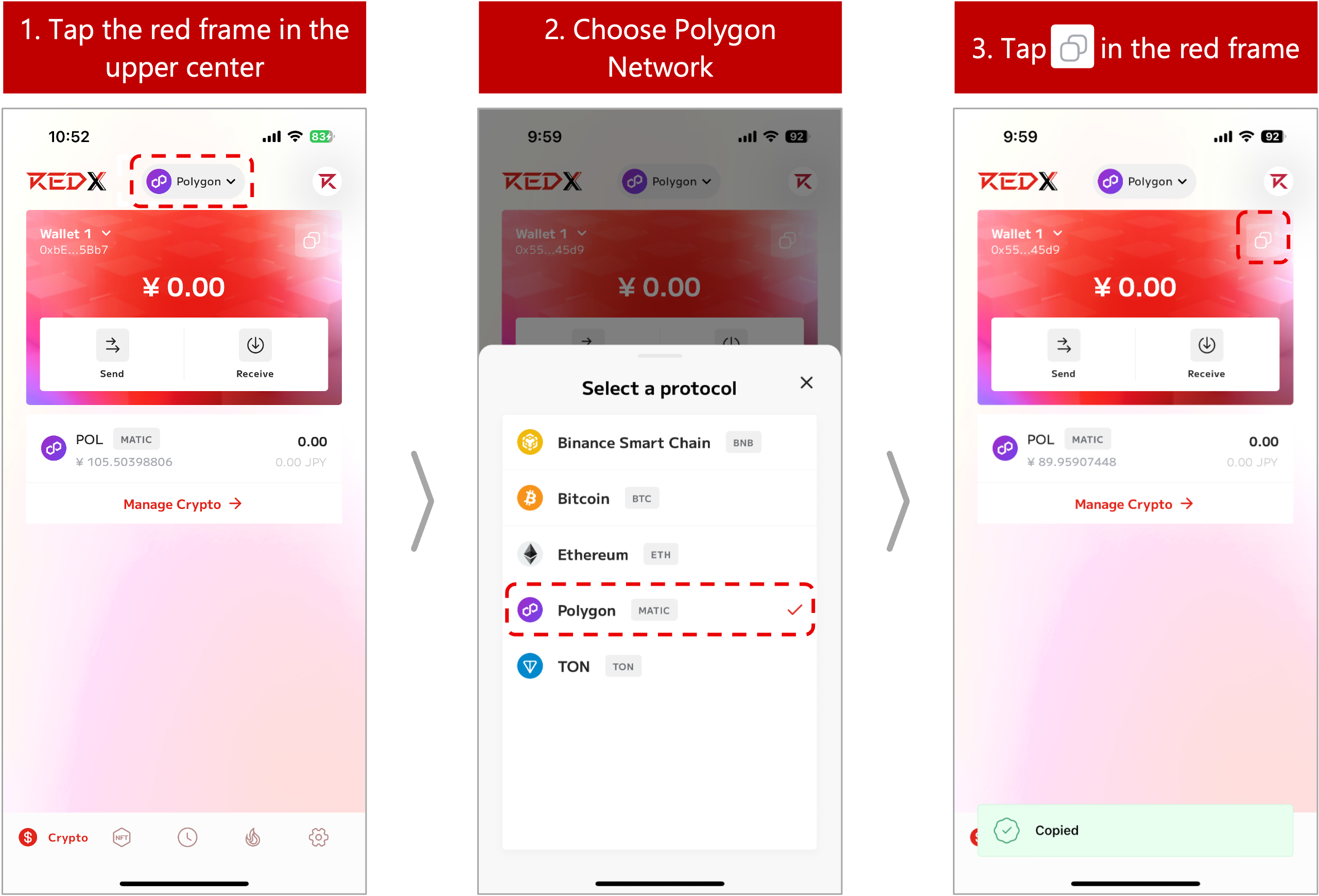 - Follow the steps below to copy the wallet address for the Polygon network.
