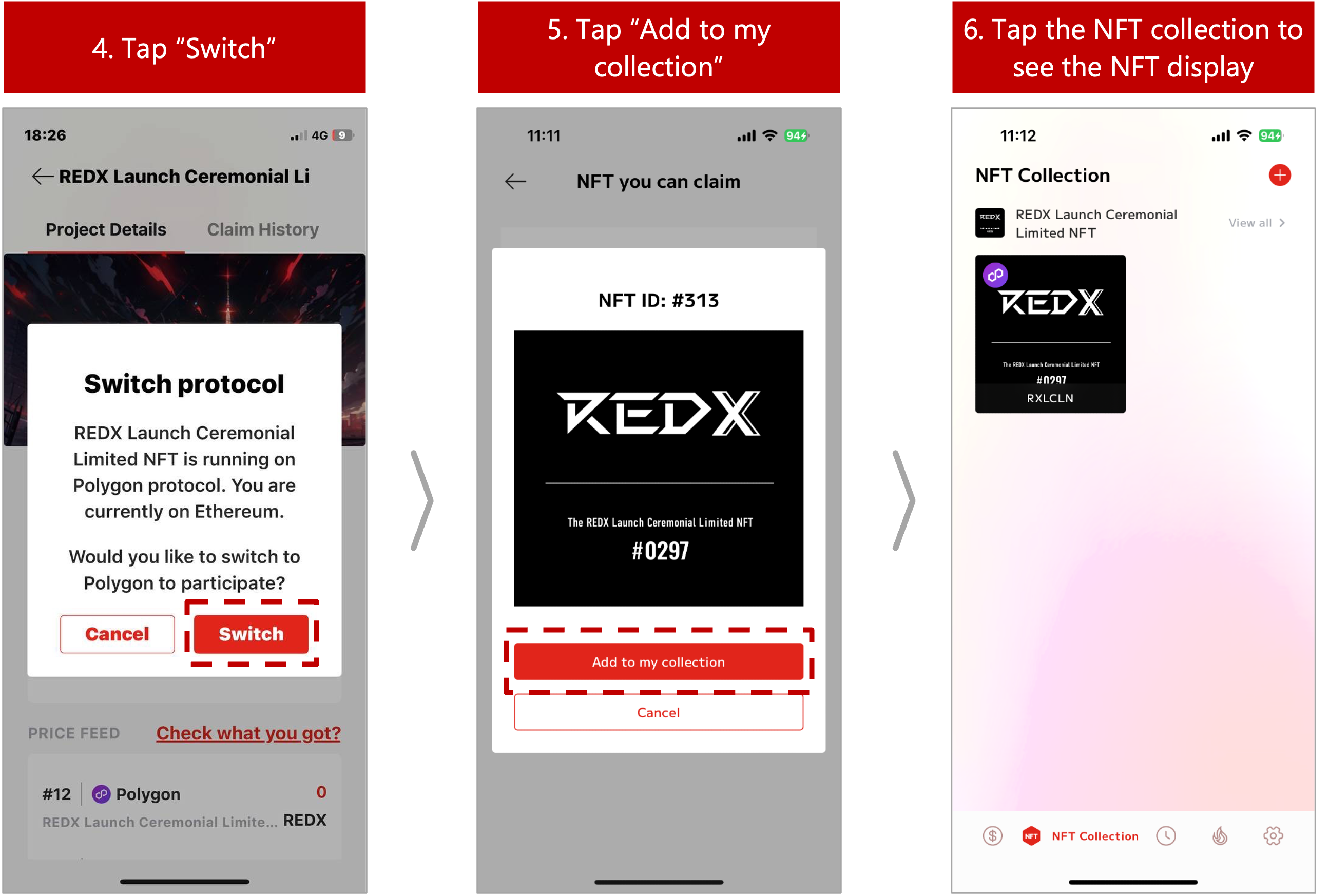 Please use the REDX Wallet to receive your NFT.(REDX Airdrops can only be claimed through the REDX Wallet.)